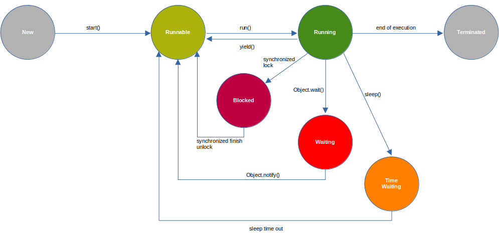 • Blocked : the thread failed to acquire the synchronization lock (because the synchronization lock is occupied by other threads);